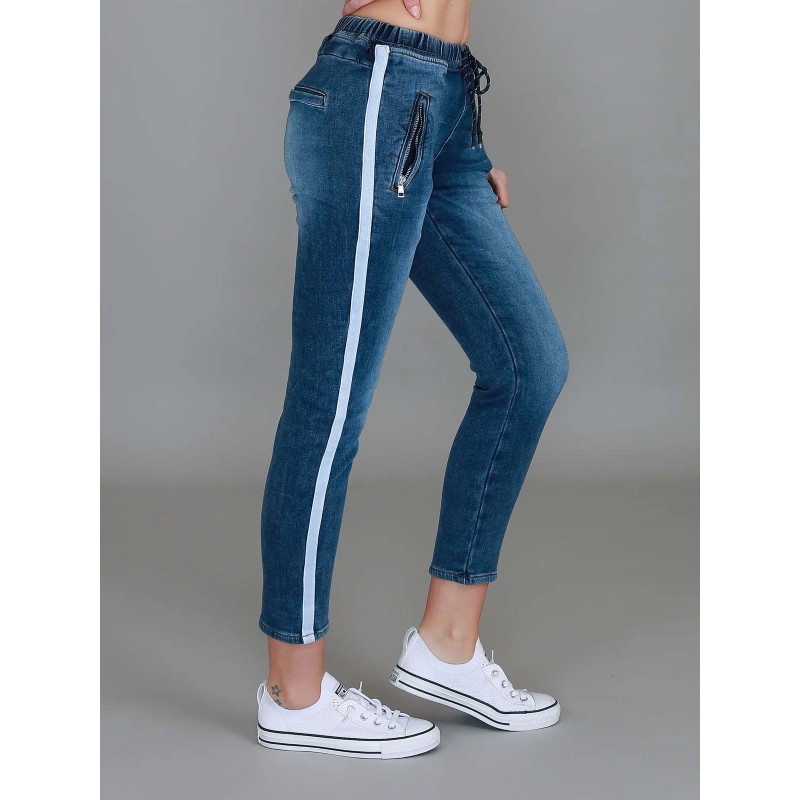 Meet the Molly Jean Jogger – where the comfort of loungewear meets the structure of denim. Available in classic black and timeless denim blue, this slim-fit jogger is crafted from premium stretch French Terry, giving you the soft feel of track pants with the look of stylish black jeans for women. Featuring a drawstring waistband, front zip pockets, and a sporty contrast side stripe, it’s a wardrobe essential for off-duty days or casual outings.